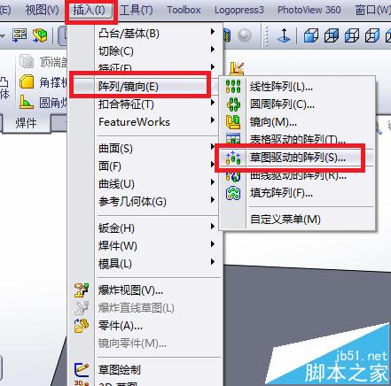 5、单击“插入”菜单中的“阵列/镜像”,在“阵列/镜像”子菜单中单击“草图驱动的阵列”。