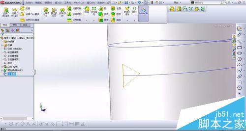 4、在螺旋线的起点或者终点位置处绘制一个三角形或者等腰梯形,为螺纹的形状。绘制完毕退出草图,然后点击扫描切除,轮廓为三角形,路径为螺旋线。