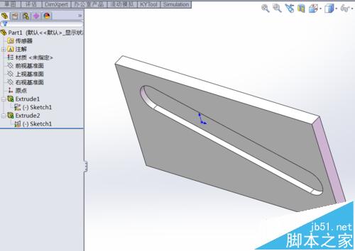 7、现在我们可以看到本次拉伸的图形结果。分别点开特征树第一个,第二个拉伸特征的子目录。我们可以看到,这两个特征所使用的草图图标上面,均多出来一个托盘小手的图案。这代表,这两个特征共享一个草图。