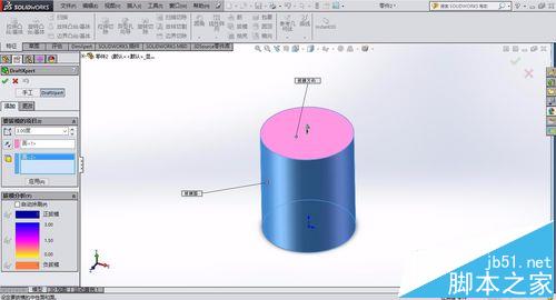 3、点击特征中的拔模,拔模角度设置为3°,拔模的方向选取为圆柱的上表面,要拔模的面为圆柱的外表面,点击确定完成拔模的创建。