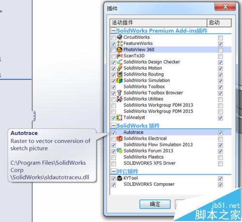 3、弹出加载选项设置框。以AUTOTRACE插件的加载为例。找到AUTOTRACE所在的行,将这一行左侧(表示当前需要加载)和右侧(表示启动时需要默认加载)的选框分别打上勾。点击确定。