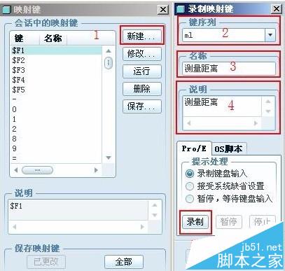 2、在映射键对话框中点选标号1处“新建”->标号2处输入“键序列”(就是键盘的快捷键)->标号3和4处输入名称和说明->点选5处“录制”。