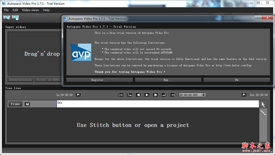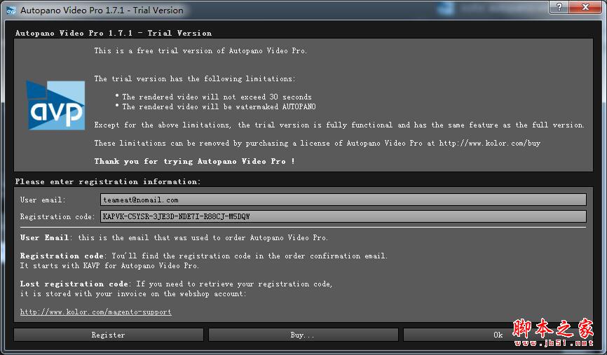 5、点击打开kolor autopano video界面,会出现注册界面。如图
