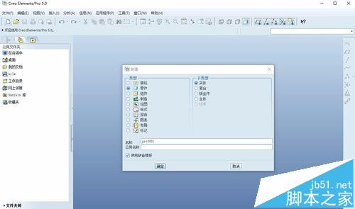 1、首先,双击打开或者右键选择打开proe5.0软件,使用其他版本的软件或者core都能使用该教程;然后,新建一个实体文件,使用缺省,点击确定。