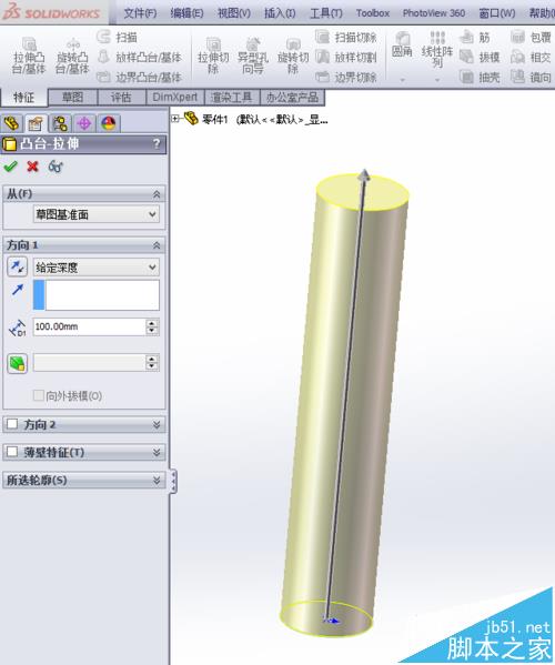 2、然后拉伸一个圆柱,圆直径20mm,拉伸100mm。