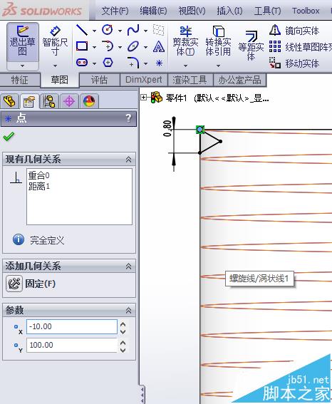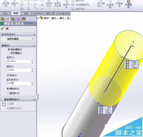 3、点击 特征-曲线-螺旋线/涡状线 然后在圆的顶面画一个和圆柱直径相同的园,退出草图,随后将旁螺旋线参数设置成图片上的。