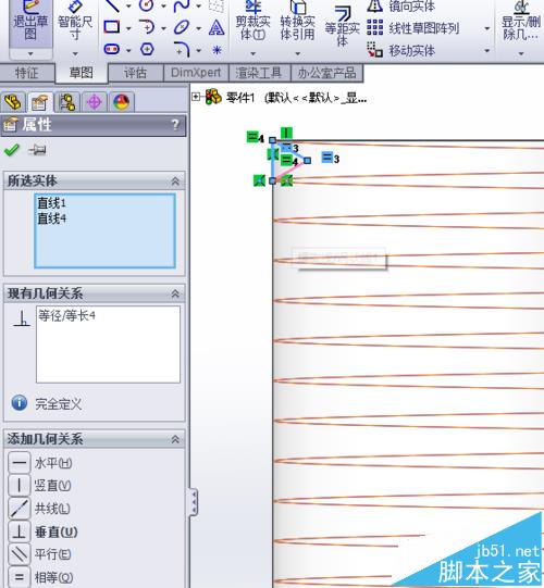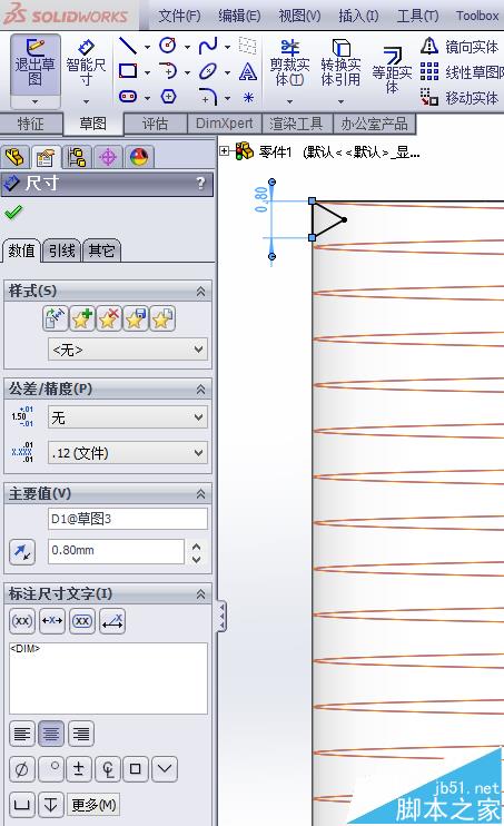 4、在右视基准面新建草图(右视基准面必须在圆柱中央)画一个三角形,三条边设为相等,边长度设为0.8,其他看图片。