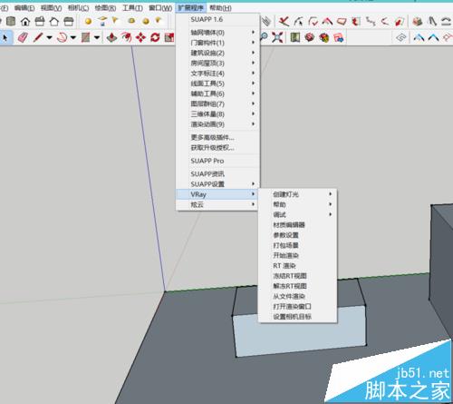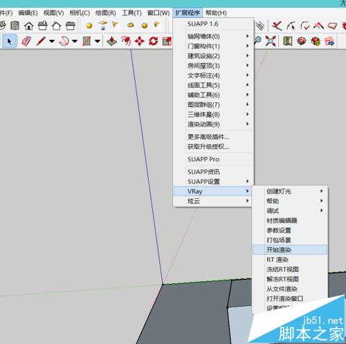1、在安装好vary插件的电脑上打开su模型选择好角度。点击上方的扩展程序。