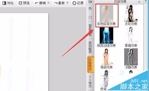 6、点击风格特效选项,进入风格特效的选择界面区,在这个界面内找到彩色铅笔效果选项,如图所示: