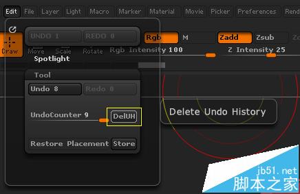在ZBrush菜单栏中打开Edit面板,单击“Delete Undo History”按钮就可以删除历史记录。