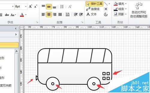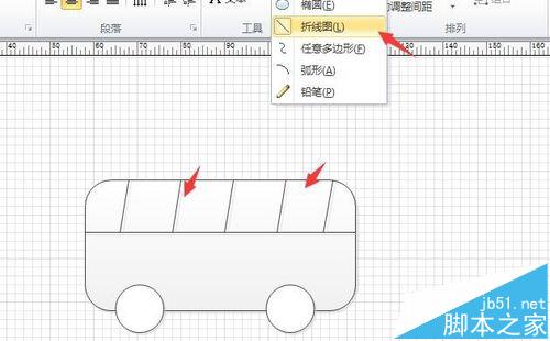 4、紧接着用“折线图”工具绘制出车窗结构,并全选所有图形,调整其线条粗细和颜色,如图所示。