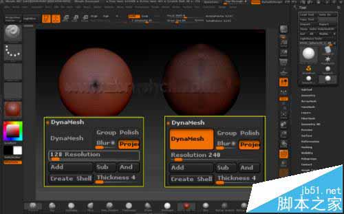 ZBrush 4R2开始出现了DynaMesh这个命令,可以快速把物体的布线重新分布均匀,效果如图所示。左边的球体为默认的网格结构,右边的球体为执行过DynaMesh的网格结构,Resolution数字越大网格密度越多。
