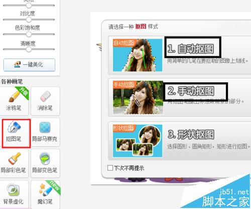 3、打开图片之后,选择其左侧的“抠图笔”,在弹出的小窗口中选择“自动抠图”或者“手动抠图”,这个视情况而定。