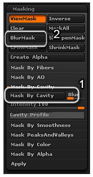 5、接下来,进入Masking子菜单,激活Mask By Cavity选项,将遮罩所有的空洞,然后按Blur Mask按钮模糊遮罩边缘。