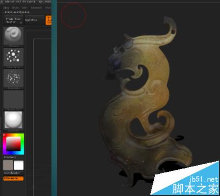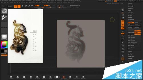 首先是找到玉佩的参考图,考虑制作Mask。在ZBrush中直接制作,方法是把图片导入到ZBrush中,点击快速面板中的MakeAlpha,然后建立一个片模型拖拽出来。最后细细的绘制Mask。这一步也可以在PS中绘制好,但在PS中要绘制成黑白图才可以。