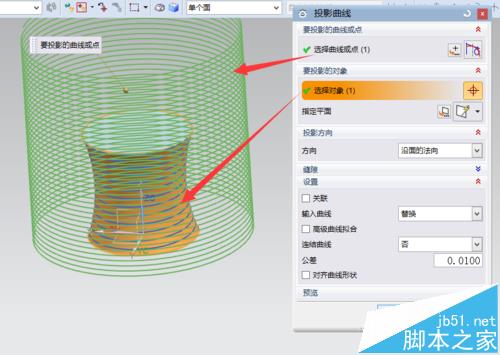 4、使用曲线投影功能,把上一步绘制的螺旋线投影到旋转体的表面上;