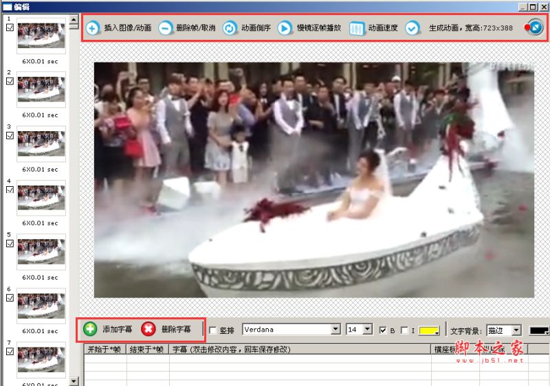 第五步、点击字幕按键,我们可以在gif上添加字幕,我们可以在不同的帧数上添加不同的字幕,还可以选择字体和颜色,添加好以后关闭该窗口就行了。