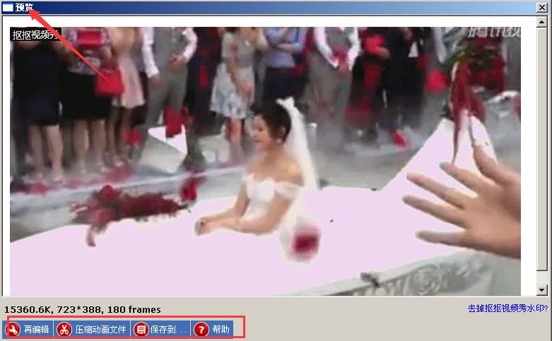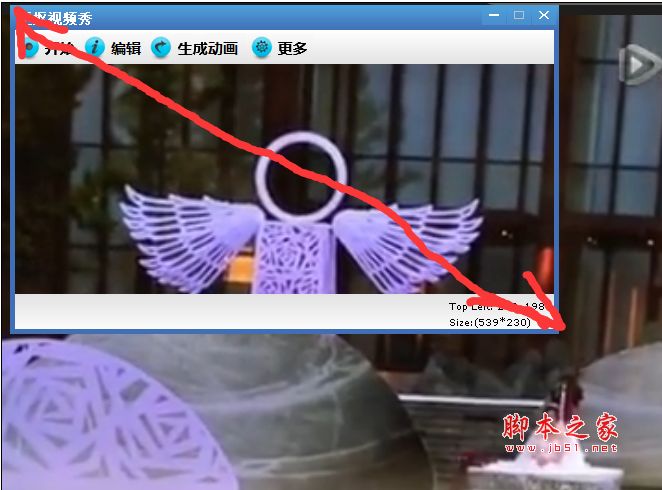 第三步:把“抠抠视频秀”置于视频窗口的前面,然后中间透明区域左上角对准视频播放器画面的左上角,然后鼠标按住“抠抠视频秀”的右下角,然后拉动框子,使这个右下角对准视频画面的右下角。