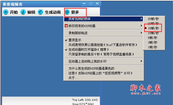 选择“抓取视频的频率”---“15帧/秒”(这个数值越大,GIF录制的越完整);