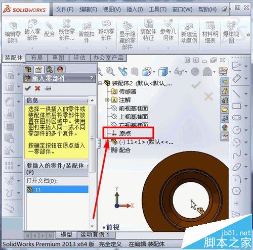将教你在solidworks装配体模式下,如何使第一个零件图的原点与装配体坐标原点重合。
