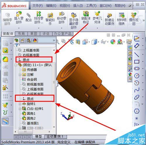 7、现在准备查看零件原点与中标原点是否重合,展开零件特征,点击装配体默认原点,再点击零件原点,如图所示