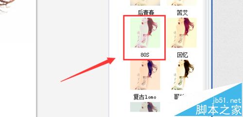 6、点击lomo选项,在lomo选择区域里找到80s选项,如图所示: