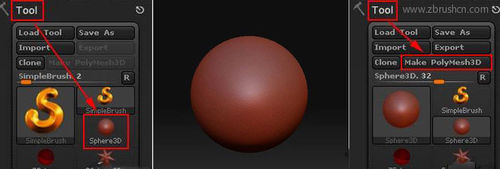 1、ZBrush中的标准几何体是参数化物体,而参数化物体是不能用Subtool下的Extract命令的,所以要先将参数化物体进行转换。选择Tool>Sphere3D, 在ZBrush中建立一个球体。点击Tool>Make Polymesh3D将参数化球体转化为Polymesh球体以便进行Extract命令。如图所示。