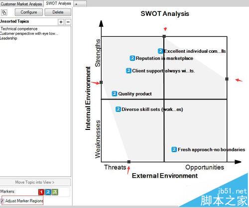 如果选择的主题不需要,选中主题,按Delete键即可。主题在不同位置标记也随之改变,如果选定的SWOT分析视图类型使用条带定义标记区域,可以调整其在视图中的位置来调整主题的主观分组,调整后,主题标记也会变化来反映这个分组的情况。点击分析视图左下角调整标记区域按钮,即可通过四个手柄调整条带的区域。
