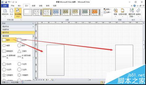 2、接着,从左侧形状栏中拖入两个矩形作为河岸桥的基石,如图所示。