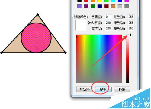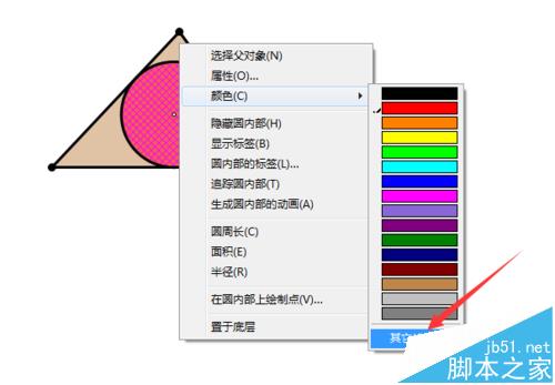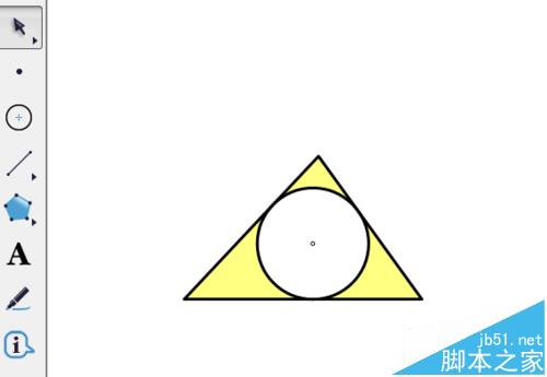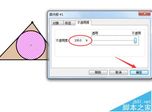 7、选中圆内部右击,单击属性--不透明度,设置为100%,确定。然后隐藏有关点,再把三角形内部颜色变成黄色,结果如简介图所示。
