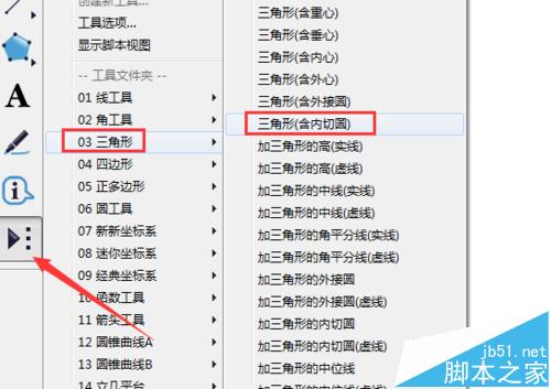 1、利用图层的不透明度来遮挡多余阴影。为了画阴影先画一个含内切圆的三角形。单击自定义工具,选择三角形---含内切圆的三角形。