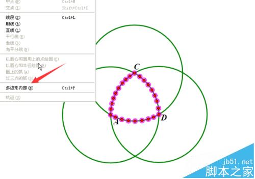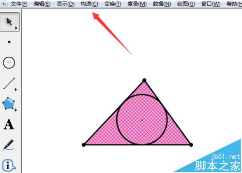 3、选中三角形三个顶点,单击构造---三角形内部。这样三角形内部就上了颜色。