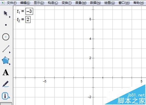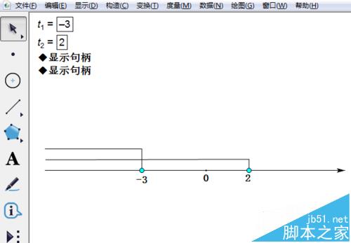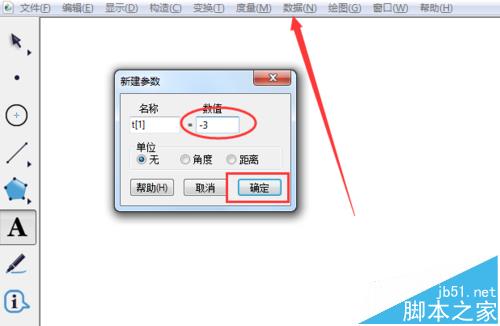 1、打开几何画板程序,先新建两个参数,比如说,我要表示不等式x<-3和x≤2的解集公共部分,我就要建立两个参数,一个等于-3,另一个等于2。单击数据--新建参数。