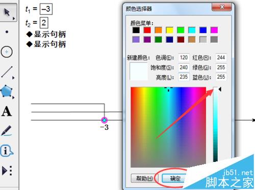 13、选中-3的对应点,单击显示---颜色---其它,选择白色,这样就显示为一个圆圈,表示解集不含端点。选中2的对应点,单击显示---颜色---黑色。