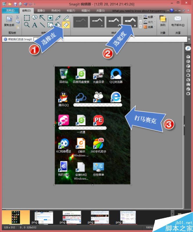 图片上想打马赛克吗?截图之后或用Snagit编辑器打开一幅已有的图片,点击编辑器的“绘制”菜单,再点击绘制工具中的“擦除”工具,从“样式”中选择某个宽度的擦除线条,就可以徒手画出任何形状的透明“马赛克”线条了。