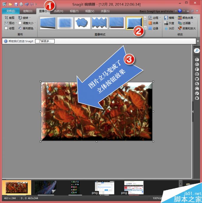 要迅速将一幅图片变成一个具有立体效果的大按钮,供网页或PPT使用吗?首先备一幅希望作为按钮背景的图片,切换到图片编辑器“图像”菜单下,在“图像样式”菜单列表中,选择最后的一个立体形状的按钮,图片马上会变成一个立体按钮。将这个按钮的原图片和效果图分别置入网页的代码中,即可实现网页按钮的动态显示。