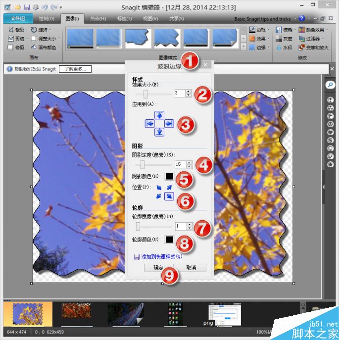 类似邮票的拒斥效果如何制作?先抓(或找)一幅图片,然后切换到“图像”选项卡,在“图像样式”中选择“边缘→波浪边缘选项”,进入波浪边缘选项定制对话框。在其中先通过滑块调节“效果大小”参数,然后在“应用到”下将四个边框都选中,再选择阴影深度、阴影颜色、阴影方向、轮廓宽度和颜色等参数,选好之后确定即可。