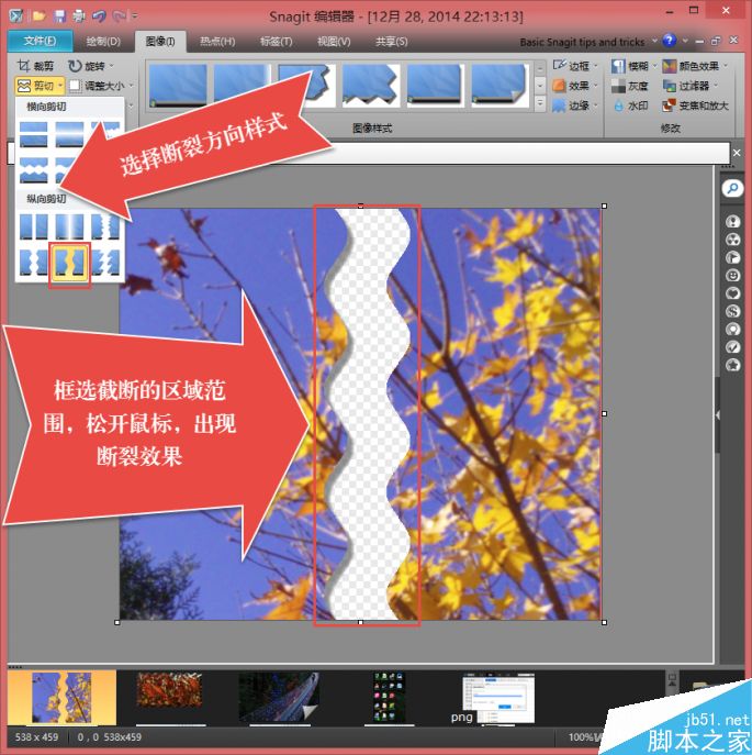 过分长或过分宽的图不便于在有限空间里展示,因此人们常将其做成断裂图,中间省去一部分。这样的图制作起来其实也容易。在抓取图片或打开一幅已有图片之后,点击进入“图像”菜单下的“画布”分组,在其中点击“剪切”按钮,在下拉列表中选择需要截断图像的具体方向,然后在画面中用框选的办法画出需要截断的区域范围,松开鼠标之后,画面马上会出现断裂的样式。