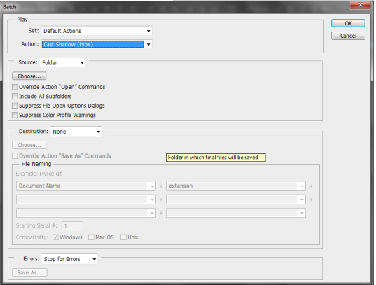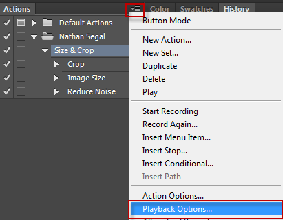 注意,在对话框顶部的三个重要的下拉三角。设置标题指的是已经记录的操作。在这种情况下,有默认设置的选项。
