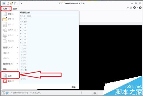 1、打开Creo界面,点击左上角的“文件”,然后点击“选项”。