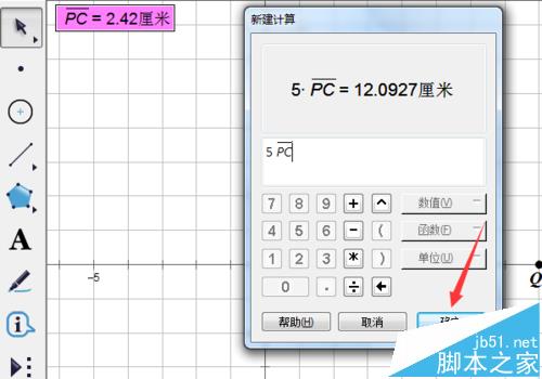6、同样的,选中点Q和5PC长度,单击构造---以圆心和半径绘圆。