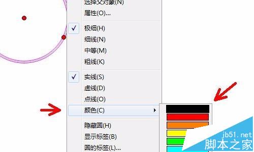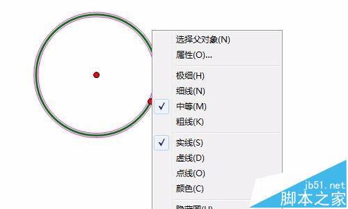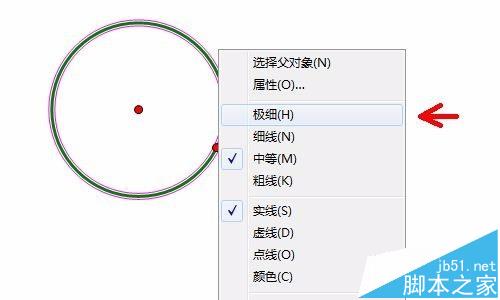 选择移动工具,然后在圆周上点一下,这是圆就被选中了,选中的时候该圆成红色显示。然后点击鼠标右键,选择线型,比如极细,然后圆就变细了。要改变圆的颜色,点击鼠标右键,选择颜色比如黑色。