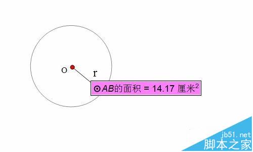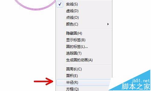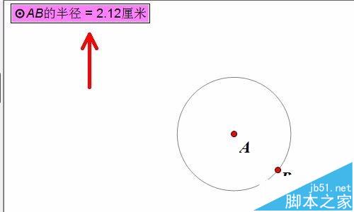 选中圆,然后点击鼠标右键,选择半径,这时,左上角自动计算出圆的半径并显示,而且圆心用A表示,圆周上一点用B表示。如果我们此时不需要显示圆的半径是多少。可以选中左上角的标识,然后按下Delete键删除就可以啦。