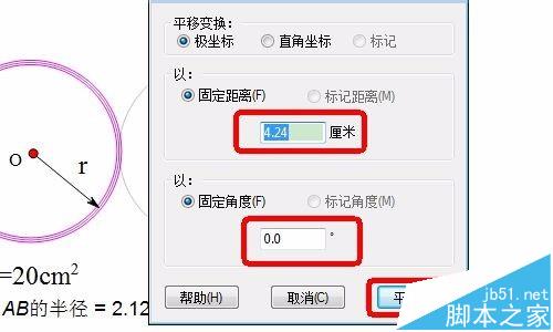 选择圆,点击半径,我们可以看到该圆的半径为2.12厘米。这时,我们计算出直接为4.24厘米。然后选择变换,平移,设置平移距离为4.24厘米,角度为0即可。然后删除半径的显示。至于画圆相交,就简单多了,相信大家都会了。