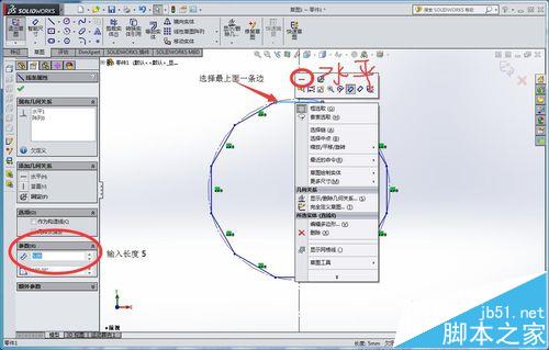 3、画一条中心线,选择最上面一条边使之平行,裁剪草图两边,设定弧长5