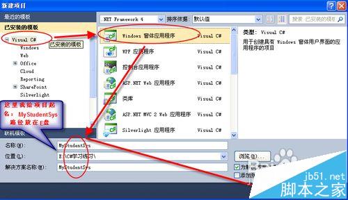 3、在出现的框中在框里选择window C# 再选择windows窗体应用程序,在名称里输入:MyStudentSys(我这里要做高校学生管理系统),这个名字自己可以根据需要起,尽量要有意义,下面的位置是自己保存项目文件的的目录,这里我放在E盘。整体界面如下: