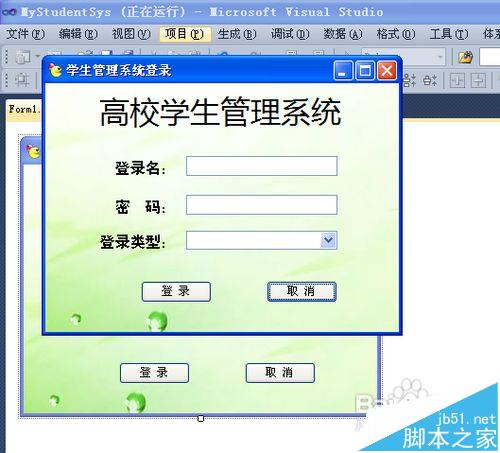 8、是不是发现和最上面做好的相比没有标题,我们可以再从工具箱里托一个label 表填,在Text属性里输入:高校学生管理系统, 把文字设为大一点,设置字体可以找到属性font 点击选择相应的大小和字体类型,最后实现如下图的效果: