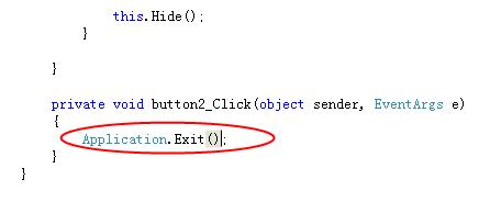12、下面我们创建 取消 按钮时间,即点击取消,就退出程序。双击取消按钮,在{} 里写上下面的代码:Application.Exit(); 如下图