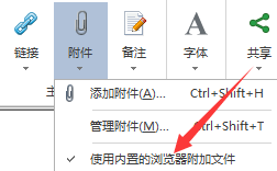 4、若要使用内置的浏览器附加文件:在开始或插入选项卡上,点击附件箭头,然后点击使用内置的浏览器附加文件。