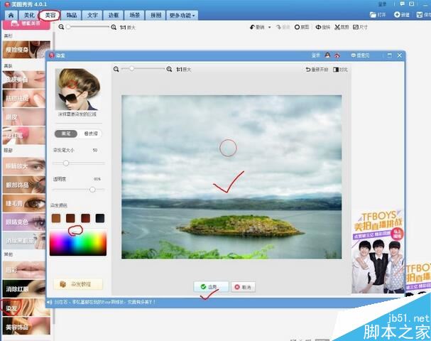 然后选择美容当中的染发功能先将天空涂白,再将天空涂蓝,如下图所示: